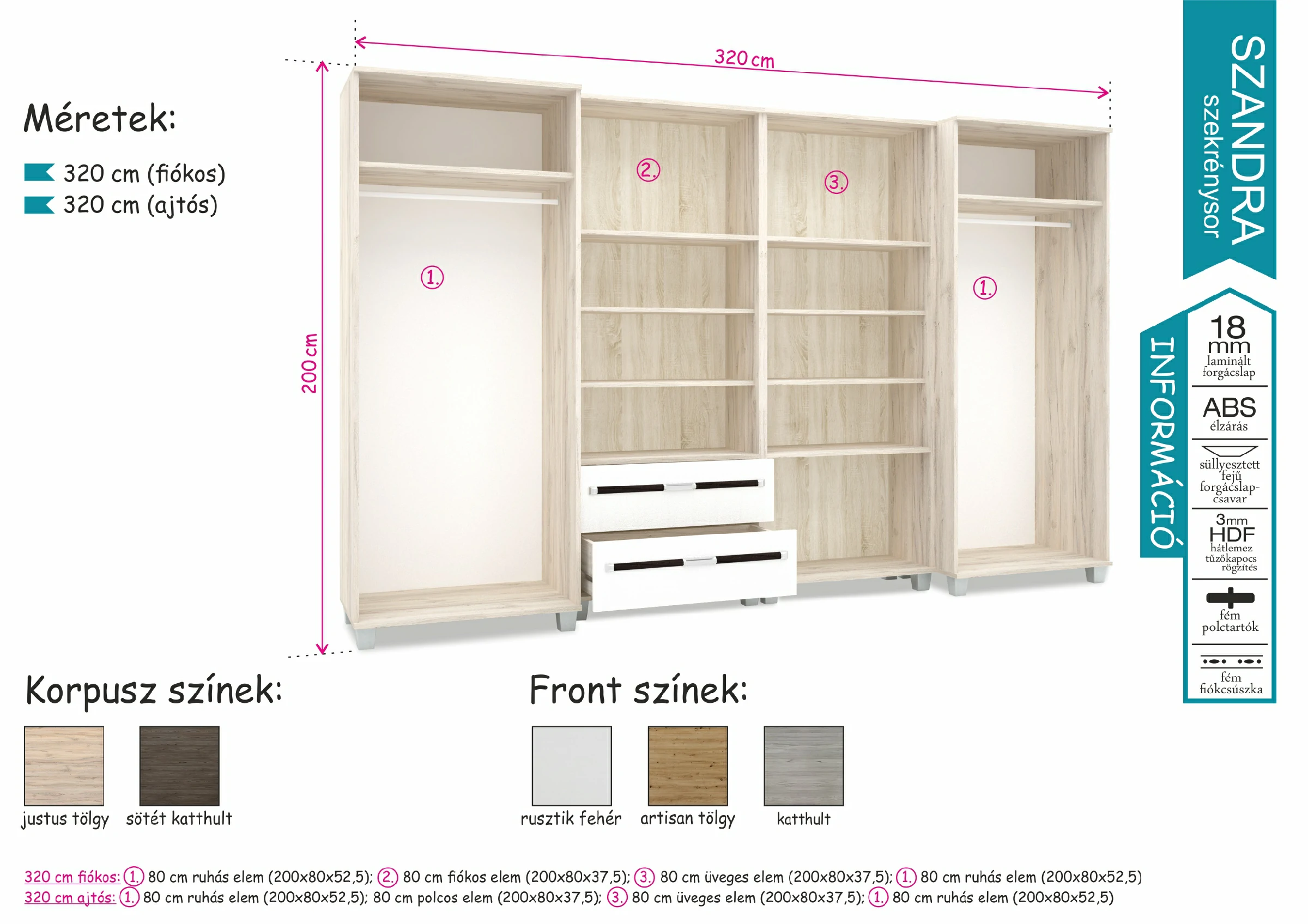 Kis helyen elfér ez a szekrénysor (320 cm). A nyitott polcos szekrénye készül fiókos és ajtós kivitelben. Elemenként is rendelhető. Kivitele: 18 mm-es laminált faforgácslap. ABS élfóliával zárva, süllyesztett fejű forgácslap csavarral összeszerelve. A hátfal 3 mm-es HDF lemez, tűzőkapoccsal rögzítve. A polcok fém polctartókkal rögzítettek. A termék új technológiájú fiókmozgató mechanizmussal készül. Az újítás lehetővé teszi a teljes kihúzást és megakadályozza a fiókok kiesését, ezzel biztonságosabbá teszi őket és javítja azok használati értékét. A terméket NEM lapraszerelten áruljuk.