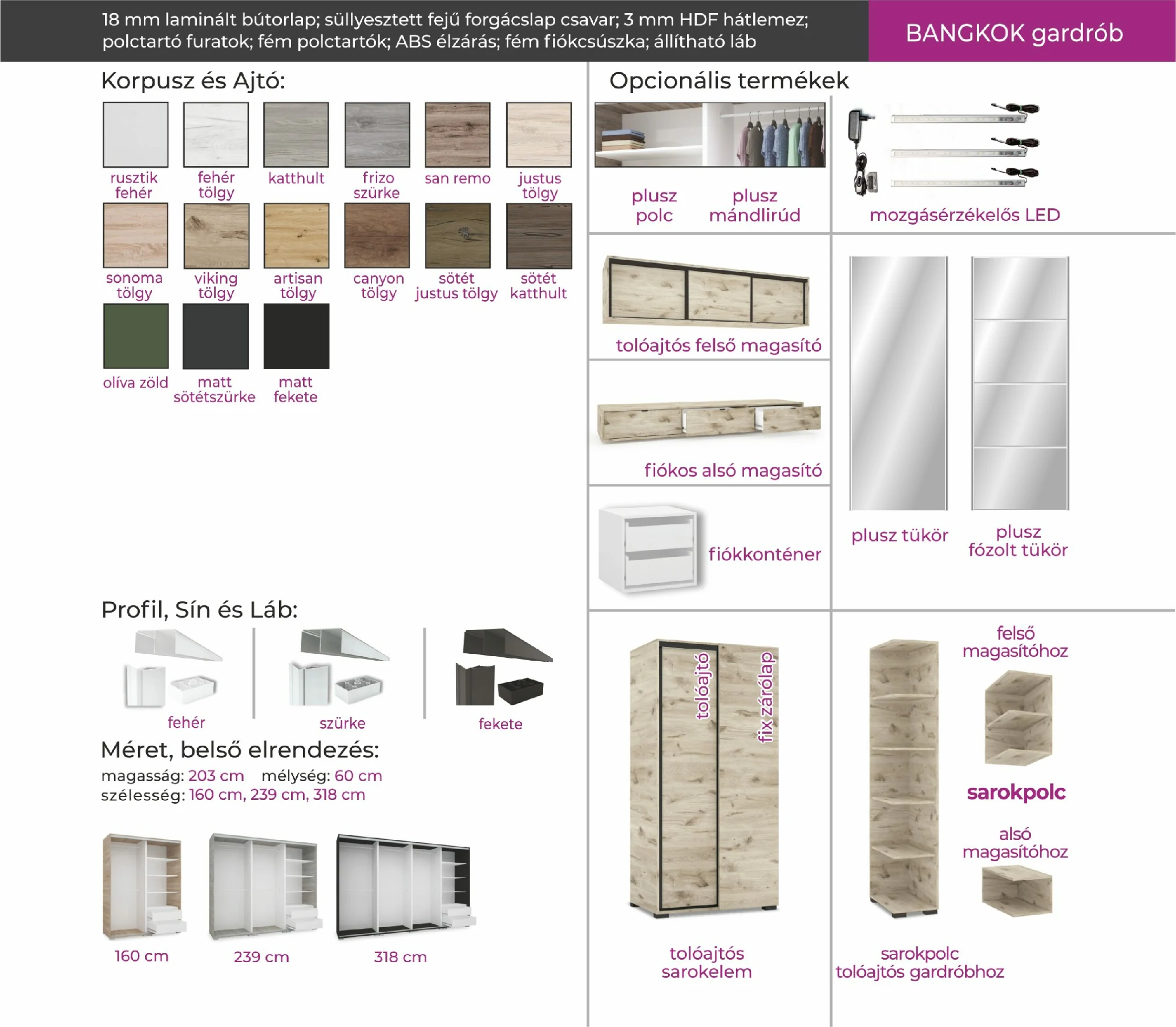 Egyszerű és modern ezzel tudjuk jellemezni a Bangkok gardróbot. Azoknak ajánlom, akik a gardróbjukon szeretnének tükröt. Mély (60 cm) és minden szempontból praktikus szekrény. Jobb oldalon fiókos-polcos kivitelű. Bal oldalon variálható: mindkét vállfatartó rúddal rövidakasztós, ha kivesszük az alsó vállfatartót a hosszú kabátok tárolására is ideális.(Mind két vállfatartó a szekrény tartozéka.)
