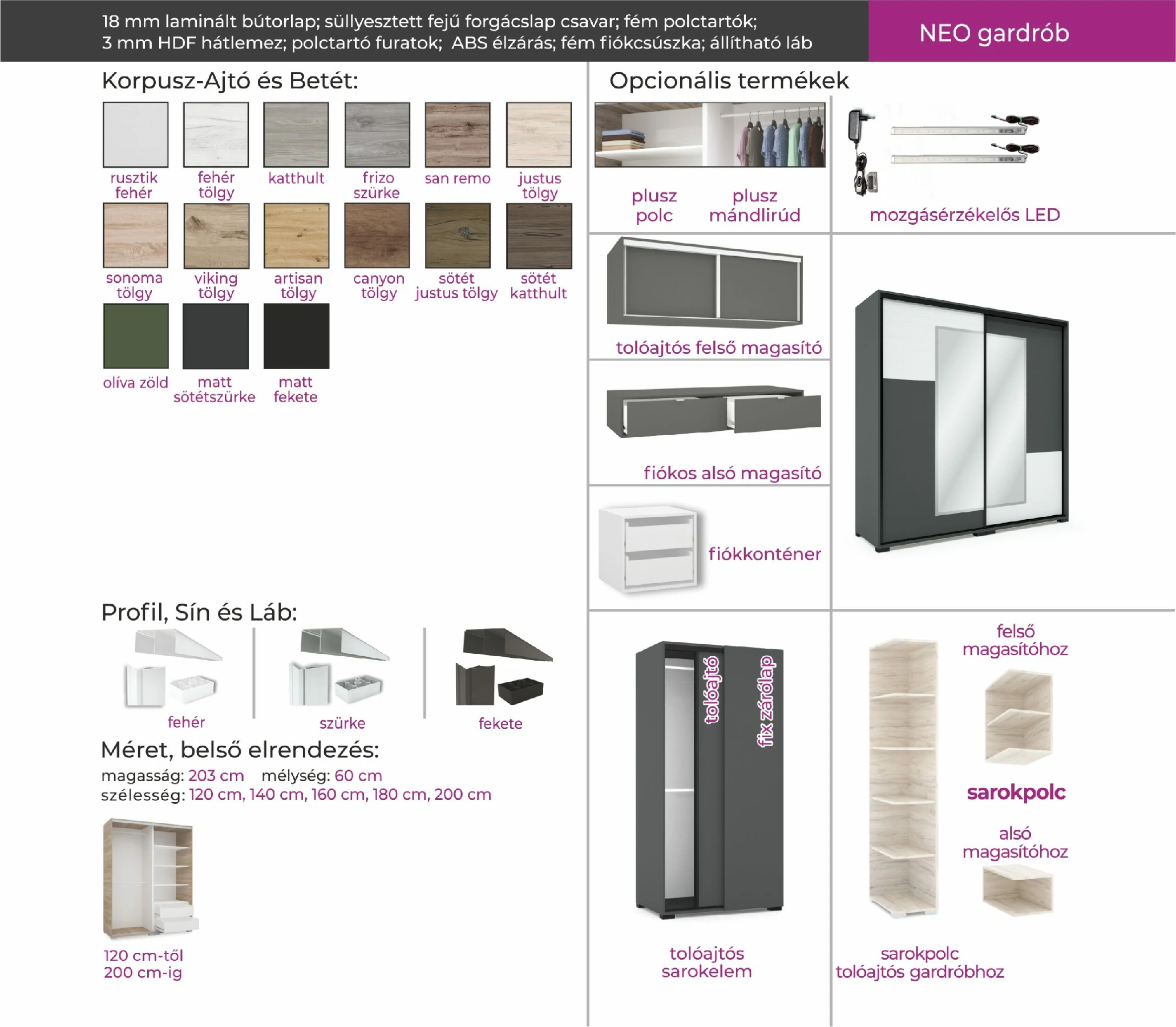 A Neo gardrób tolóajtaja különleges betétet kapott, ami az ajtó színével szabadon variálható. A gardrób 5 méretben kapható. Kiegészíthető magasítókkal, sarokelemmel vagy akár sarokpolccal is. A gardróbhoz rendelhető még plusz fiókkonténer és polc is.