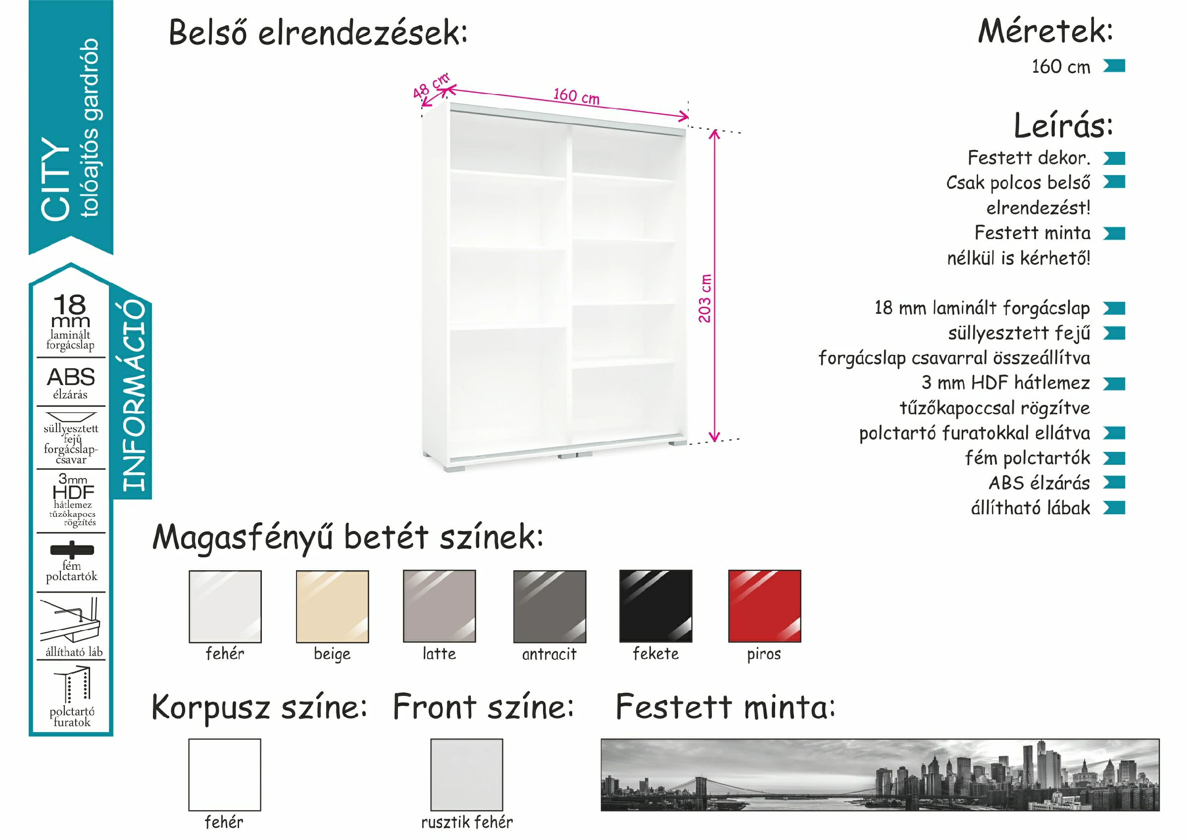 A City gardrób fehér korpusza rusztik fehér ajtóval lett kiegészítve. A középen elhelyezkedő üveg dekor lehet városkép, vagy akár 6 féle betétszín. Két oldalt az üveglapon átívelő fogó található, ami a könnyebb használatot hivatott segíteni. Betét nélkül is kérhető. Letisztult, egyszerű formavilágával könnyen beilleszkedik a legtöbb hálószobába. 160 cm-es variációban kapható, polcos belső elrendezéssel. Mindössze 48 centiméter mély, ennek köszönhetően helytakarékos, belsejében mégis kényelmesen elférnek ruháink.