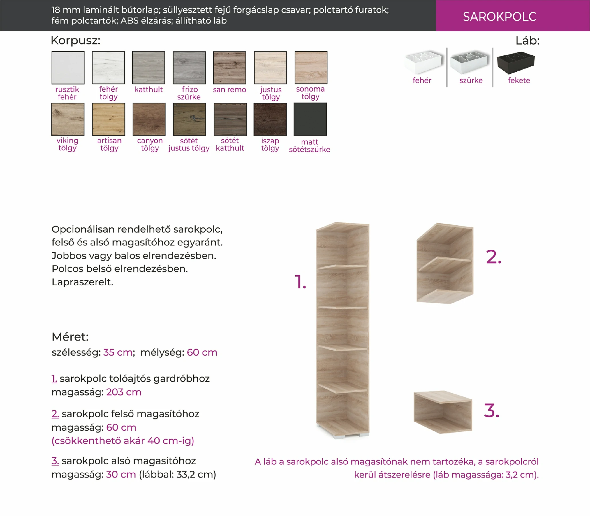Tolóajtós gardróbjainkhoz, alsó és felső magasítóinkhoz opcionálisan rendelhető sarokpolcaink segítségével hálószobája még otthonosabbá tehető.