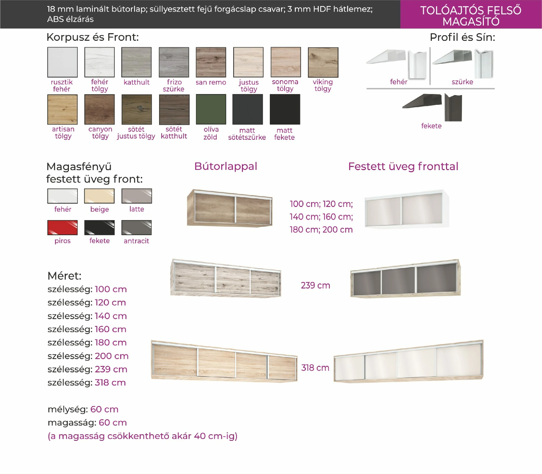 Opcionálisan rendelhető bútorlapos illetve magasfényű festett felső magasító, 100-318 cm-es méretű gardróbokhoz illetve a tolóajtós sarokelemhez.