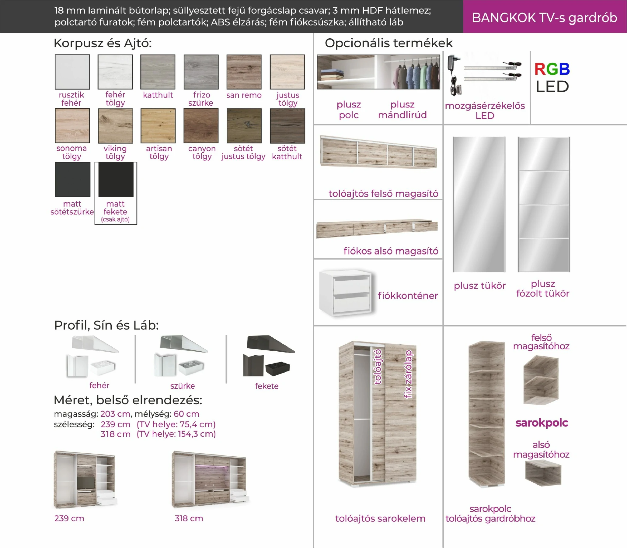 Opcionálisan választható termékek: – sarokpolc – tolóajtós sarokelem – fózolt tükör – tükör – fiókos alsó magasító – tolóajtós felső magasító.