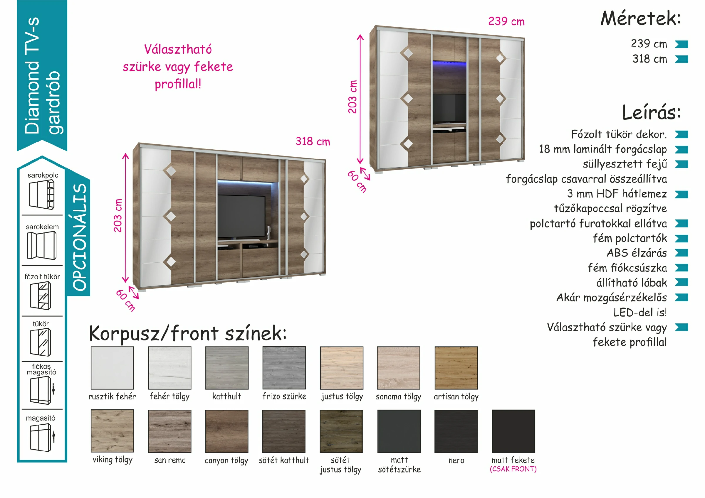 Egyediségét az adja, hogy zárt állapotban egy elegáns tolóajtós gardróbnak tűnik, viszont a középső részen televízió számára kialakított hely található.