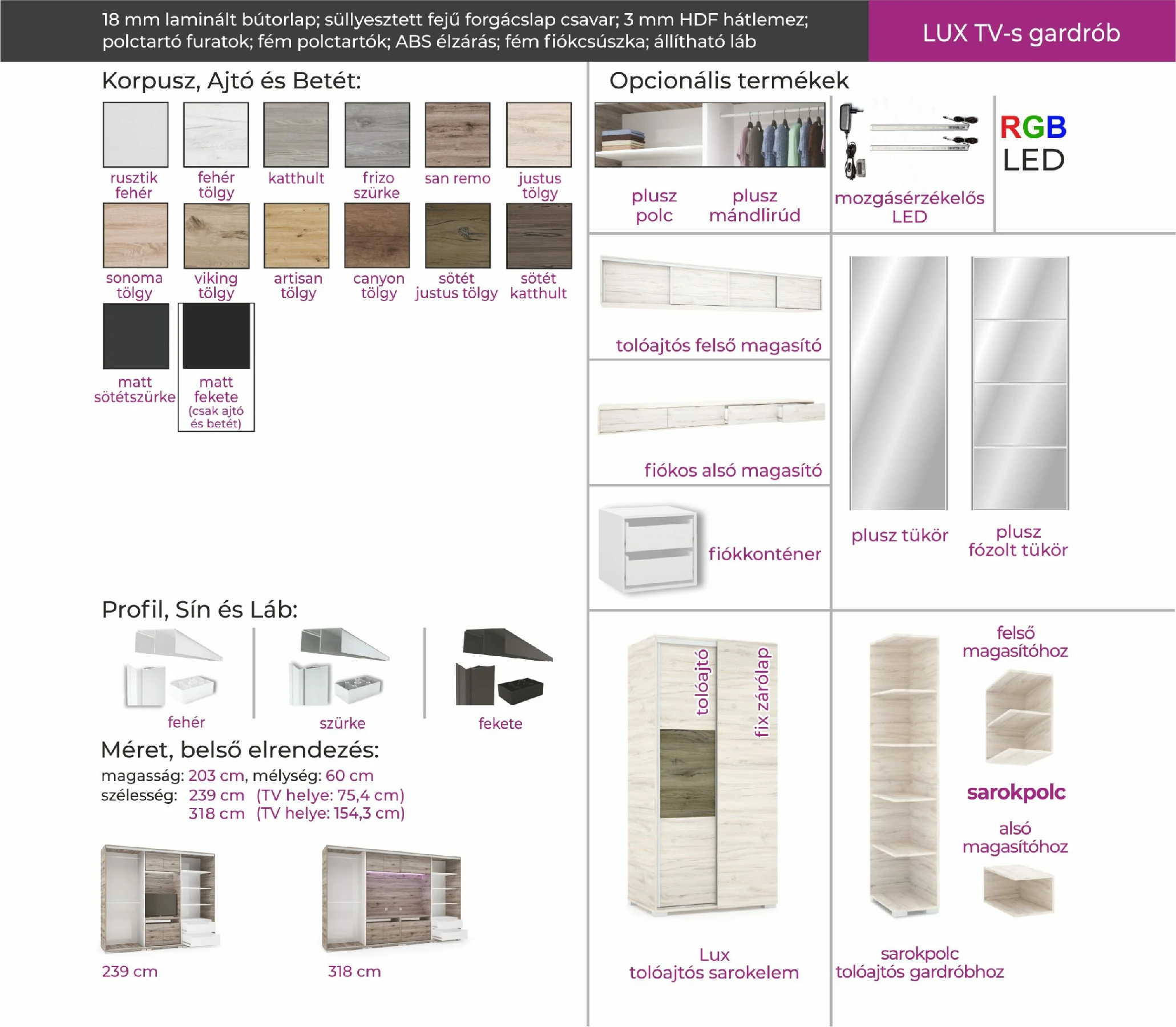 Opcionálisan választható termékek: – sarokpolc – tolóajtós sarokelem – fózolt tükör – tükör – fiókos alsó magasító – tolóajtós felső magasító.
