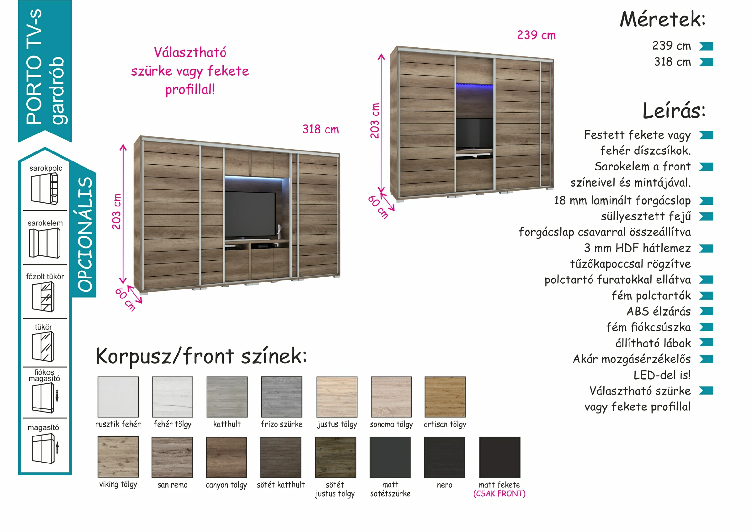 Egyediségét az adja, hogy zárt állapotban egy elegáns tolóajtós gardróbnak tűnik, viszont a középső részen televízió számára kialakított hely található.