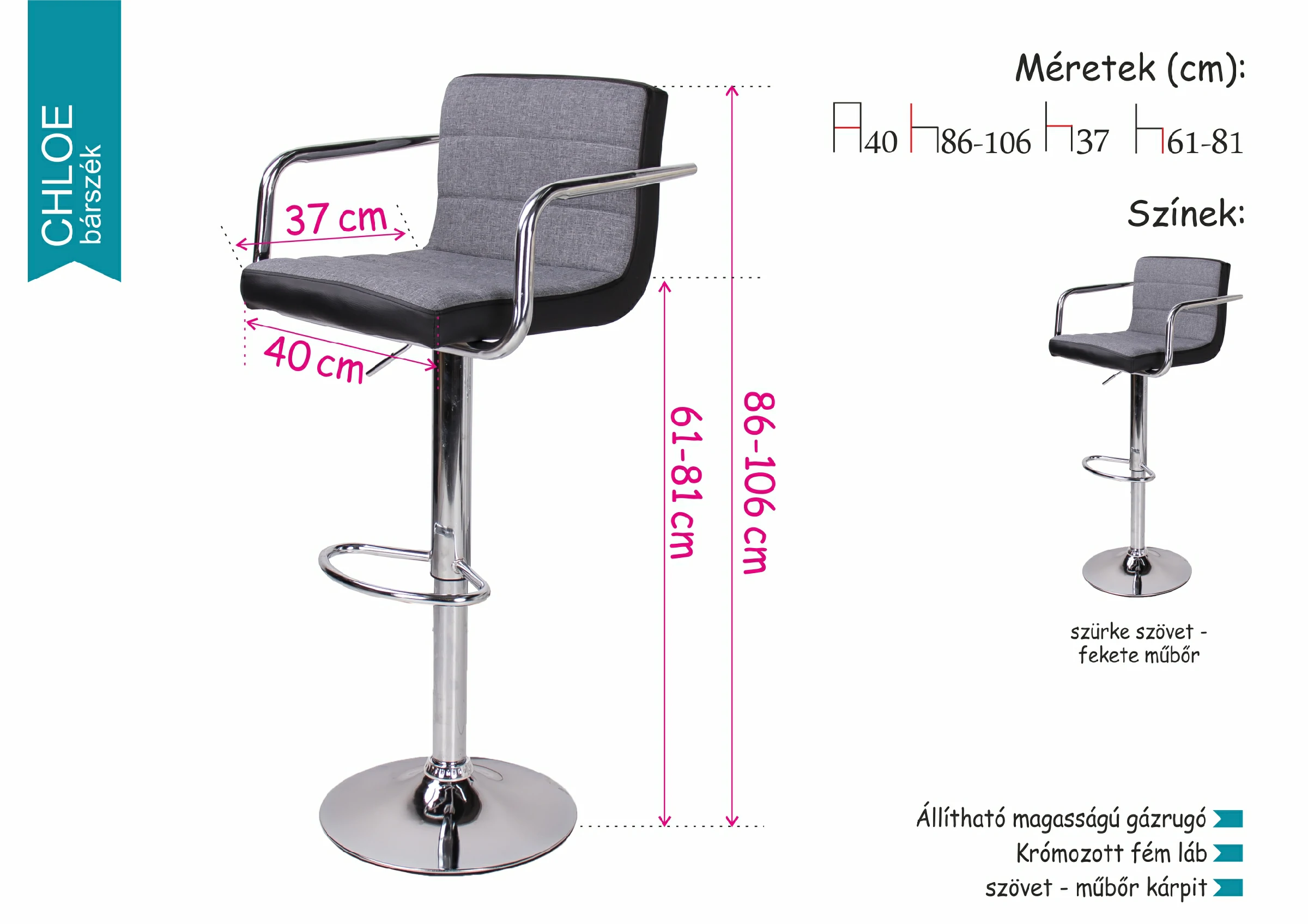 A Chloe bárszék szürke szövet – fekete műbőr kárpit kombinációjának köszönhetően a legtöbb lakás lakberendezési stílusába beilleszthető.