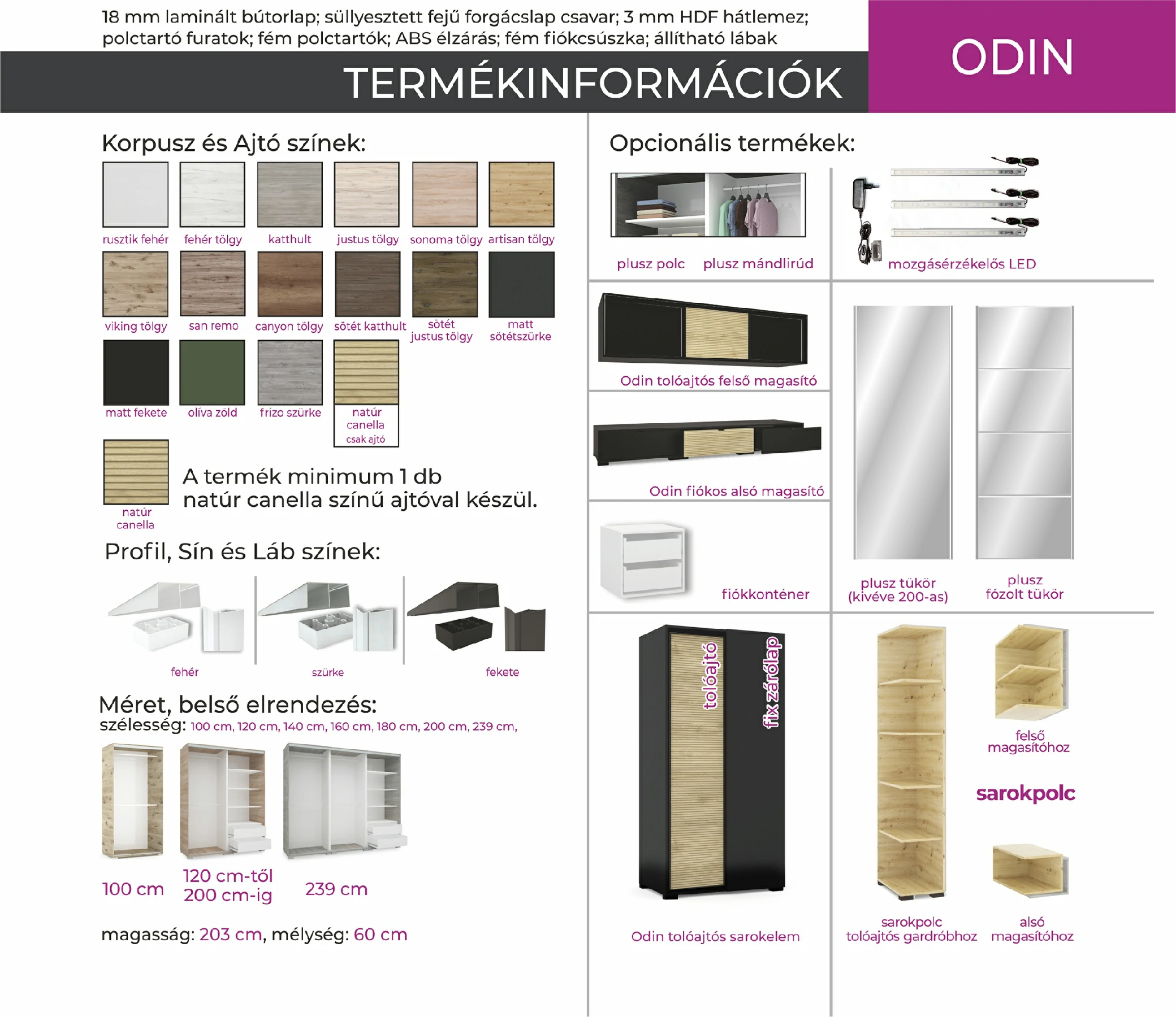 Opcionálisan választható termékek: – sarokpolc – tolóajtós sarokelem natúr canella ajtóval és választható korpusz színnel – fózolt tükör – tükör – fiókos alsó magasító (a gardrób színeiben) – tolóajtós felső magasító (a gardrób színeiben).