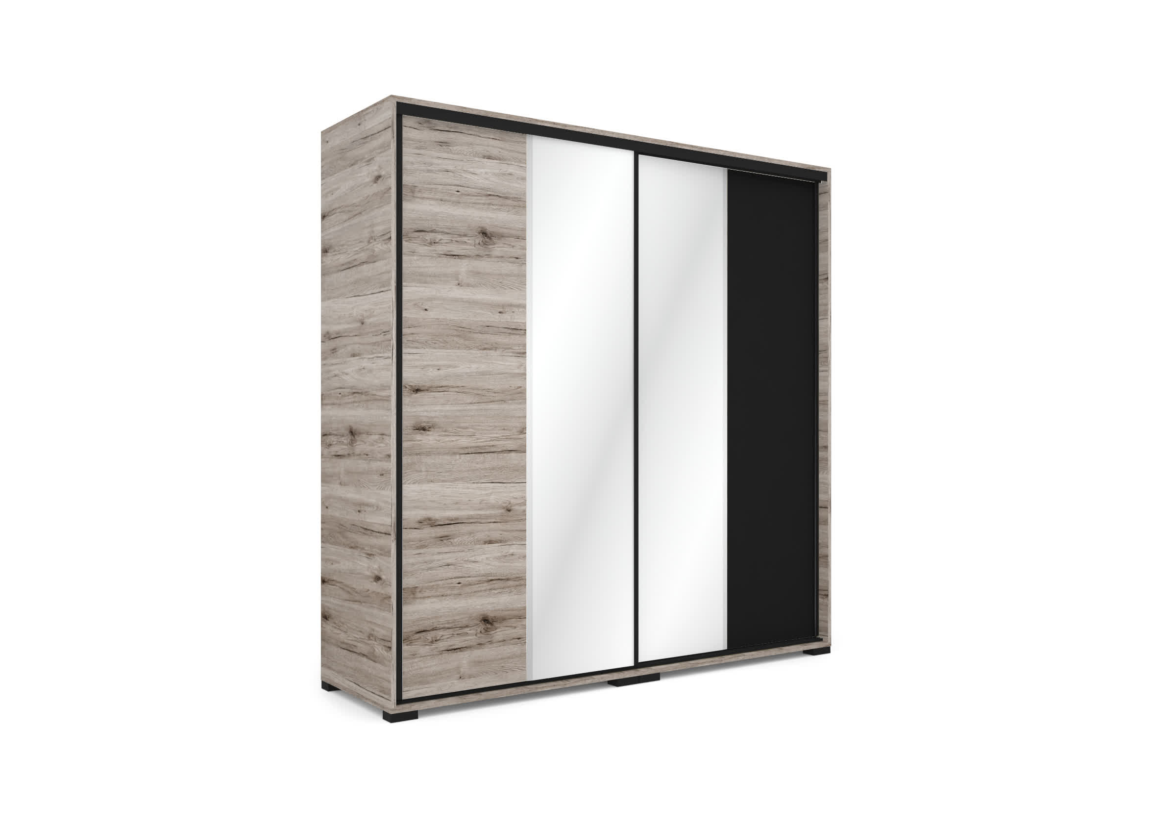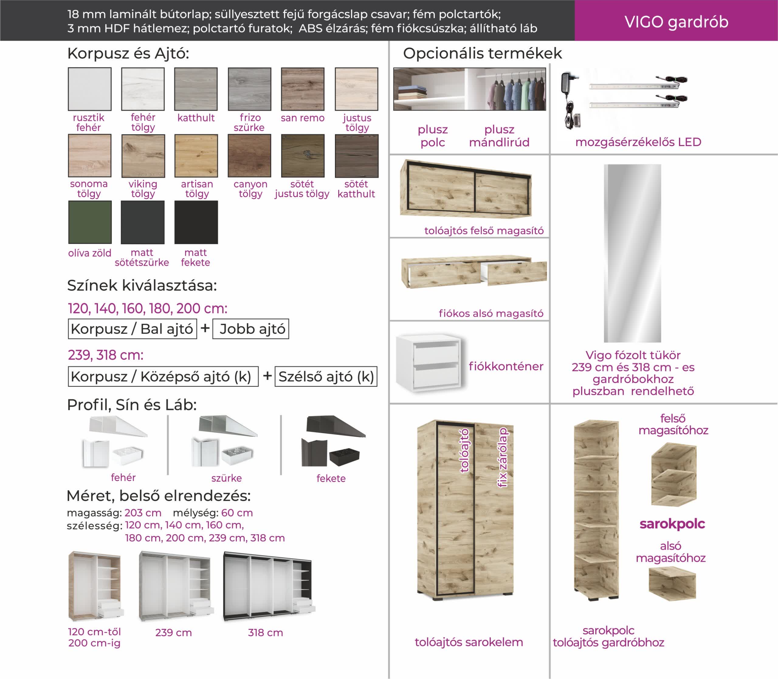 A Vigo gardrób egyedi tükör dekorációval azonnal felhívja magára a figyelmet. Kellemes bútorlapszínek, a tér növelése mind-mind jellemzik a gardróbot. 2 ajtós kivitelben 5 méretben illetve 3 ajtós kivitelben 239 cm-es méretben és 4 ajtós kivitelben 318 cm-es méretben érhető el. 15 bútorlapszín közül választhatnak kedvükre. A tolóajtónak köszönhetően a tér maximális kihasználását is lehetővé teszi. Belső elrendezése bővíthető polcokkal, fiókkonténerekkel, mándlirudakkal. Alsó és felső magasító is kérhető hozzá minden méretben.